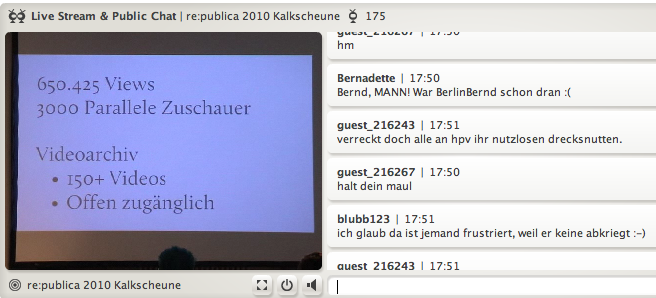 Ich finde es sehr schade, dass sich im Rahmen der re:publica solche Szenen abspielen und das ganze noch mit dem Kommentar „Ihr seid der Chat“ quittiert wird. Ich kann keinesfalls nachvollziehen, dass nicht reagiert wurde. Weder auf die homophoben Kommentare vorher, noch in dieser Situation. Wenn weder das Bannen noch das Ignorieren von einzelnen UserInnen technisch möglich ist, dann schaltet den Chat ab. Wenn dieser nicht abzuschalten ist, dann schaltet die Übertragung ab. Mir ist es lieber das Panel nicht (live) zu sehen, als zu sehen, dass Sexismus in Reinform eine Plattform geboten wird. Ihr organisiert die re:publica (dankenswerter Weise), aber damit steht ihr auch in der Verantwortung auf solche Sachen in adäquater Weise zu reagieren. Deswegen halte ich es für wichtig, dass ihr euch zu diesem Vorfall äußert und auch dazu äußert wie ihr in Zukunft mit solchen Vorfällen umgehen wollt.